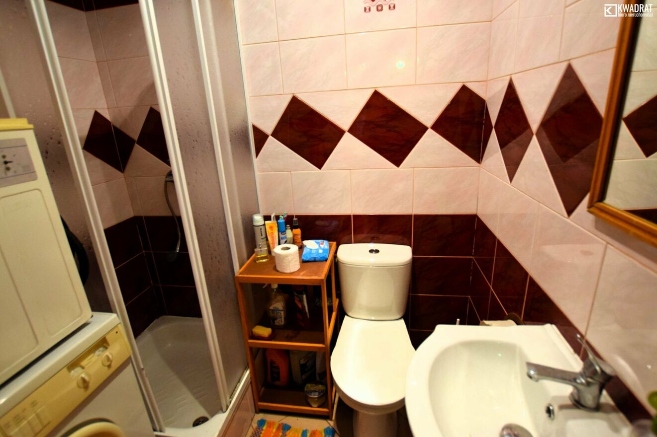 Łazienka wyposażona w kabinę prysznicową, muszlę klozetową, lustro, szafkę z umywalką.