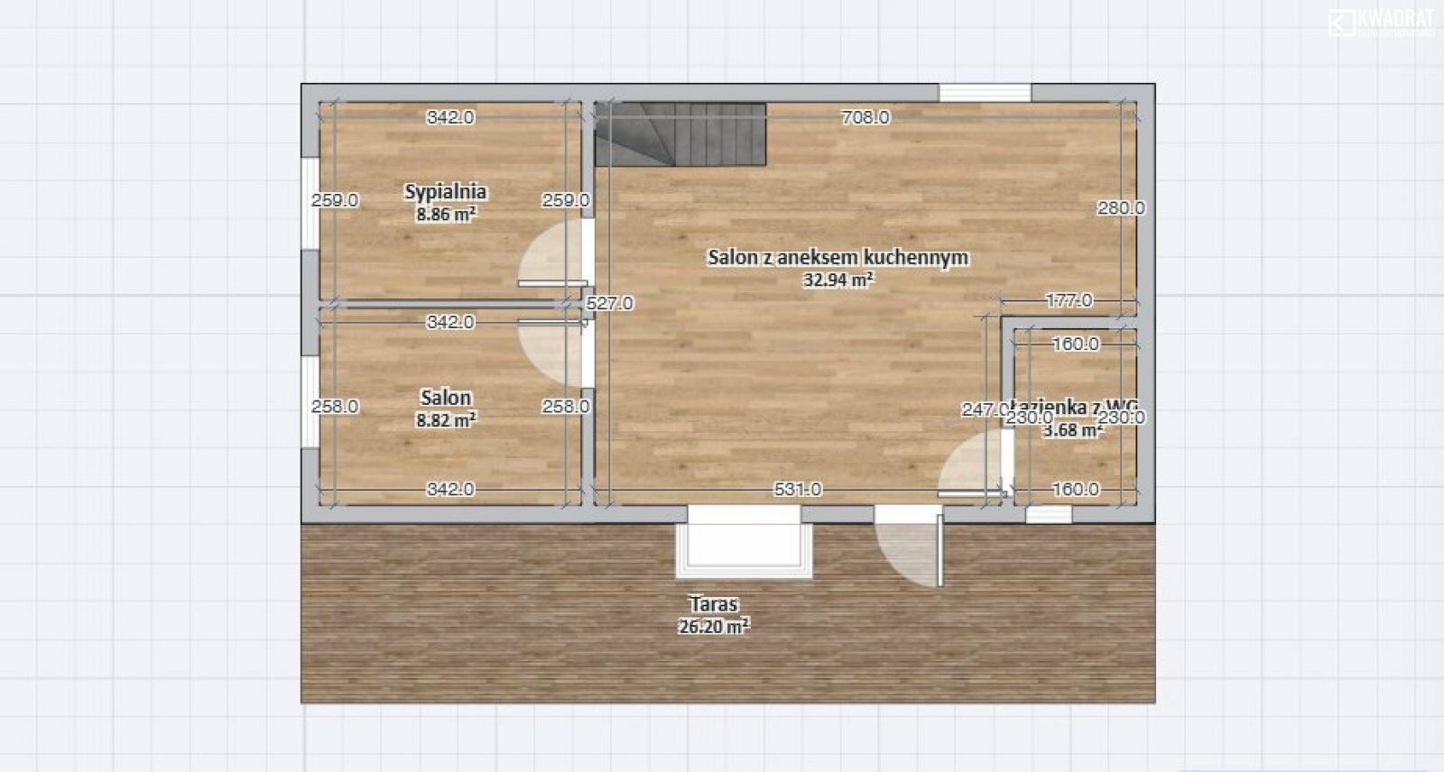 Salonu o pow. 25,99 m2 z aneksem kuchennym o pow. 4,96 m2, spiżarnią o pow. 2 m2 i wyjściem na taras o pow. 26,2 m2,